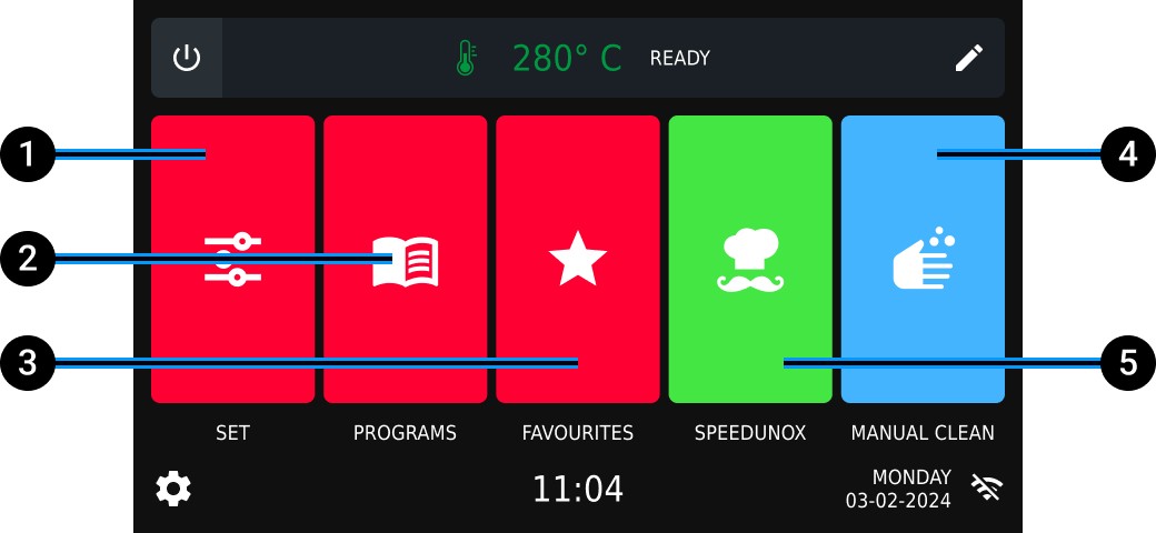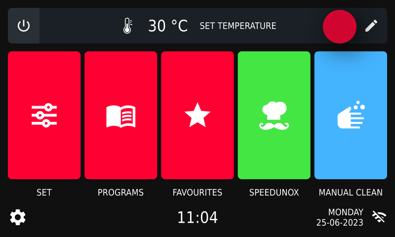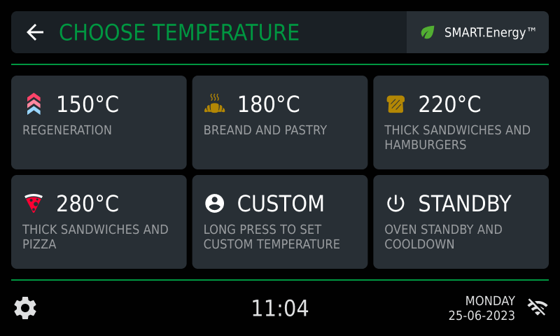 A screen appears upon starting the oven. Selecting a preset temperature for the cavity. We recommend choosing a preset before carrying out any other operation to ensure maximum service speed. By setting a constant cavity temperature, you won’t need preheating.