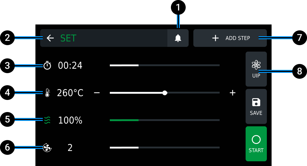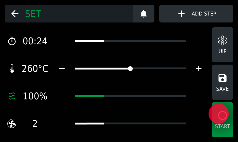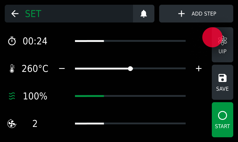 To deactivate SMART.Preheating technology and manually set preheating, tap the UIP key and deactivate the technology by moving the cursor.