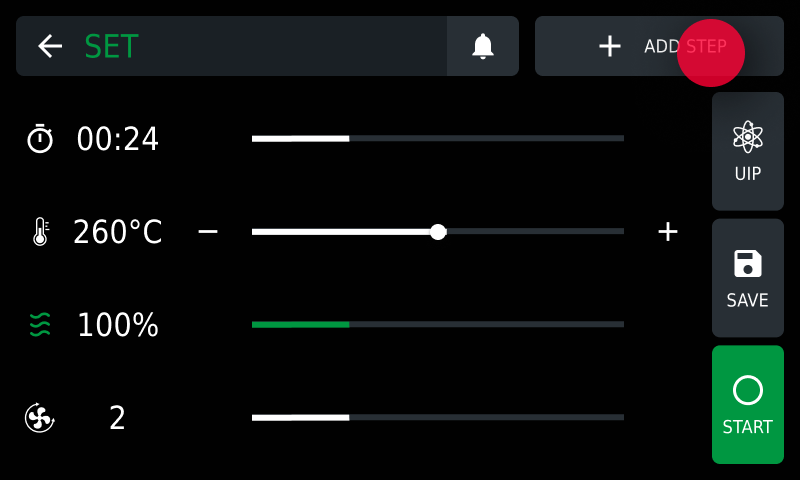 If necessary you can create cooking programs with several steps; each step can have different parameters: