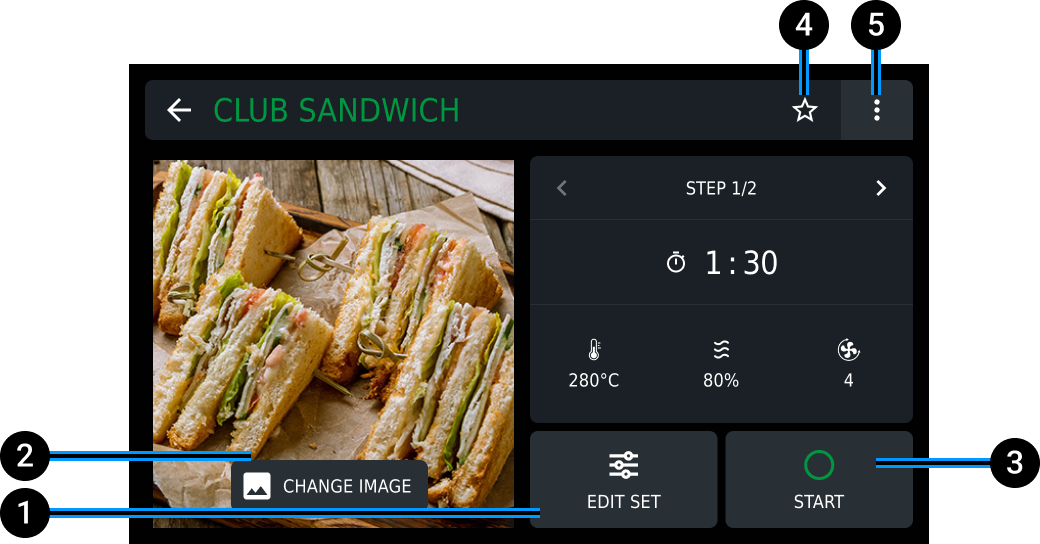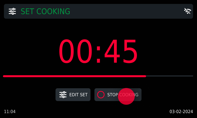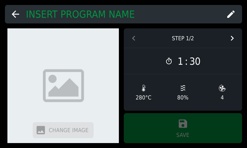 In the program section, you can start a cooking cycle by tapping the icon or by holding it down for 3 seconds. Access the details page, where you can edit the available recipe options.