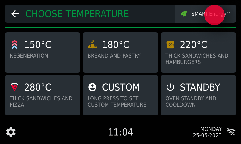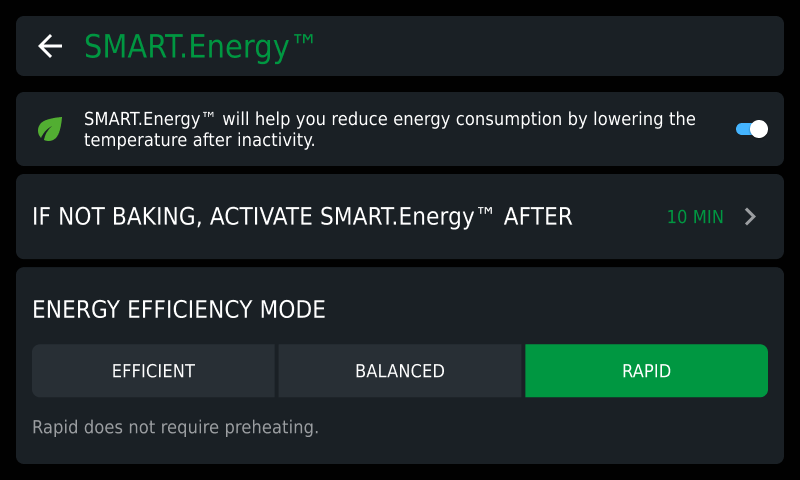To enable or disable the SMART.Energy consumption optimisation function, open the cavity’s temperature preset section. Tap the SMART.Energy key. A page opens where you can enable, disable and manage the function’s parameters.