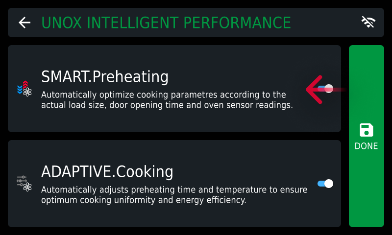 SMART.Preheating▸(active by default) automatically adjusts the preheating time and temperature to guarantee maximum cooking uniformity and energy efficiency; it also takes into account the dispersion of heat when you open the door and is activated in the passages from one phase to another, adapting the cooking cavity to the new parameters of the phase |