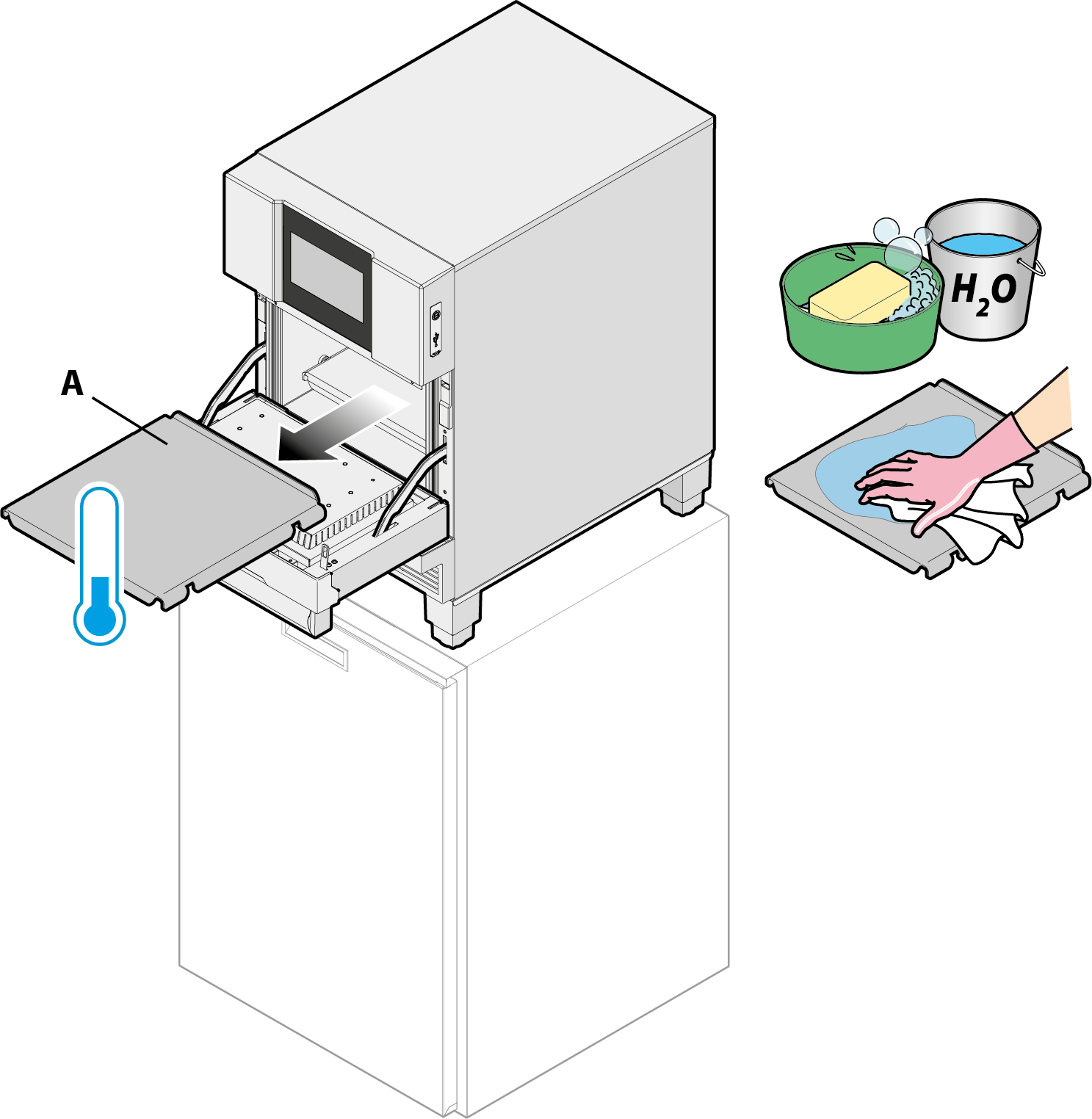 Open the oven door and remove the plate or baking tray “A”. Wash the plate/trays using a soft sponge and warm, soapy water. Rinse and dry carefully.