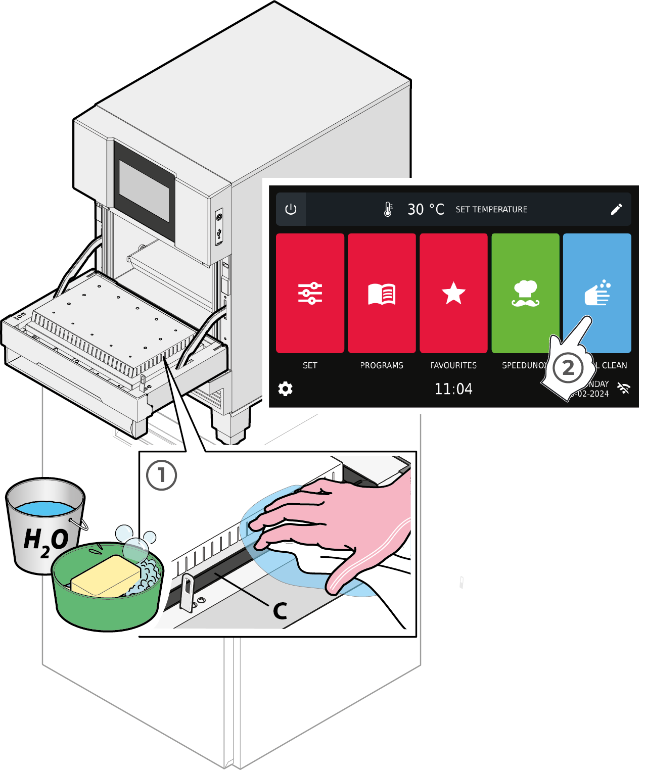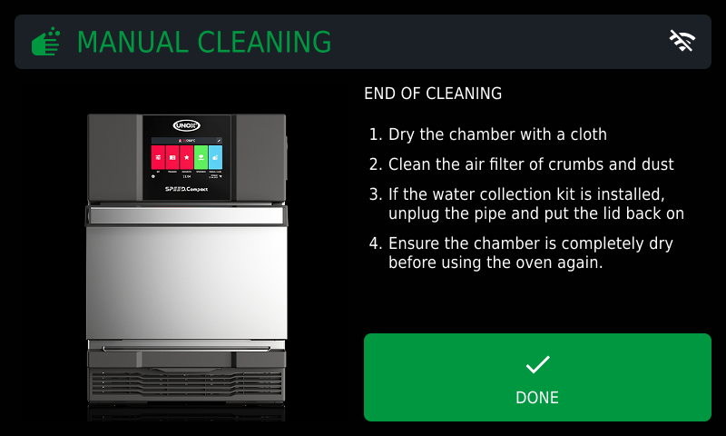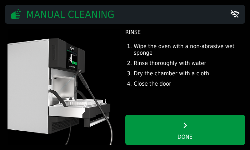 After a set time, an acoustic signal will sound and a screen will show indicating that the cleaning process with UNOX SPRAY&Rinse detergent has been completed and the softened food residue can be removed using a soft sponge. Do not use abrasive, pointy or sharp tools or cloths (abrasive sponges, scrapers, steel-bristled brushes, etc.).