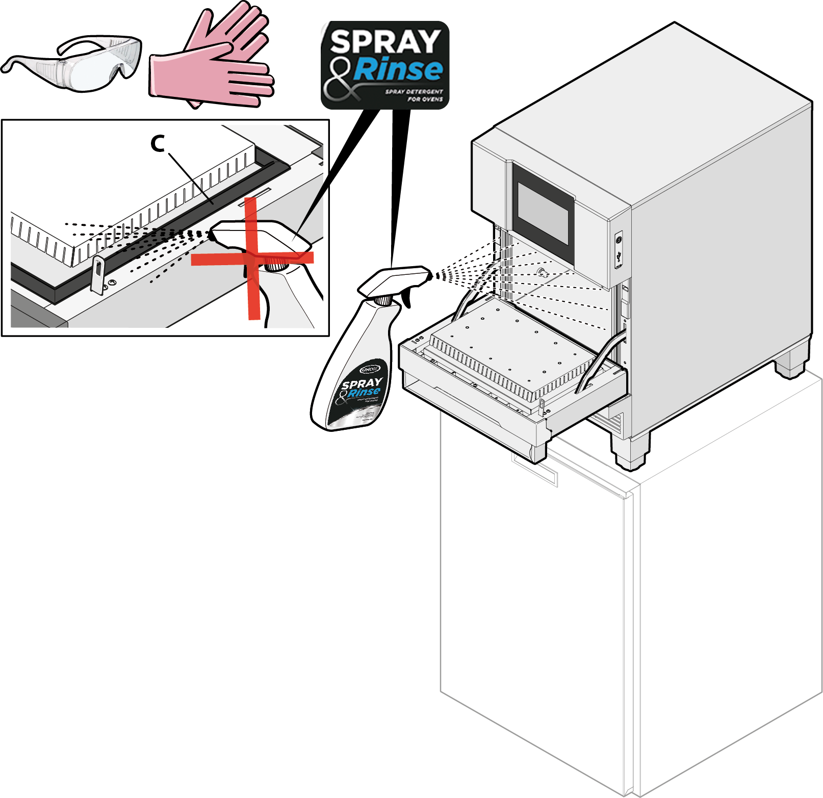 DO NOT spray UNOX’s SPRAY&RINSE product on door seal “C” as this may cause damage over time.