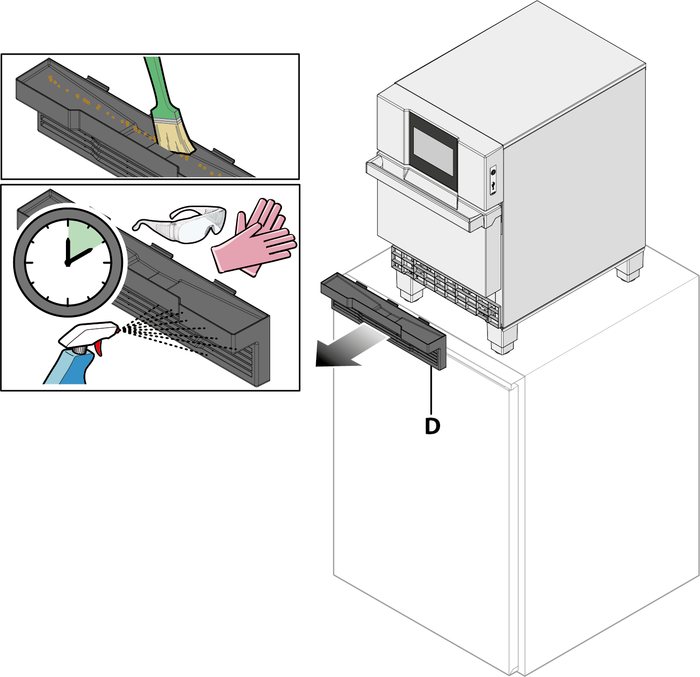 Remove air filter “D” from the magnetic fitting and empty the crumbs tray. Apply UNOX’s SPRAY&RINSE detergent to the whole filter surface and leave for 10 minutes. Rinse thoroughly and dry with a clean cloth. Put the filter back in place.