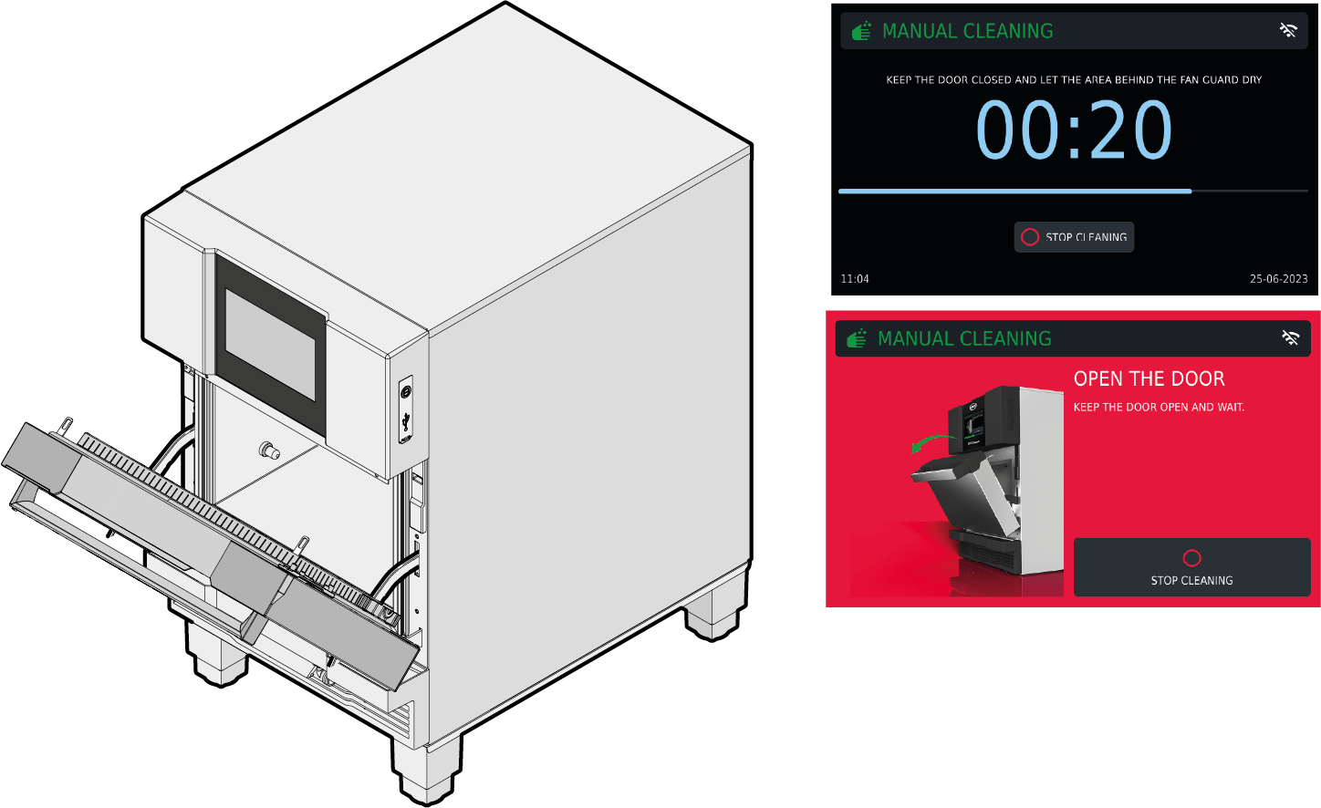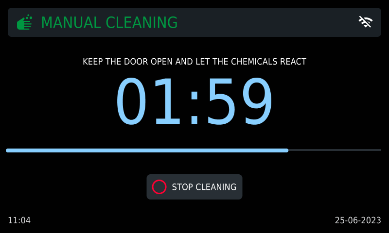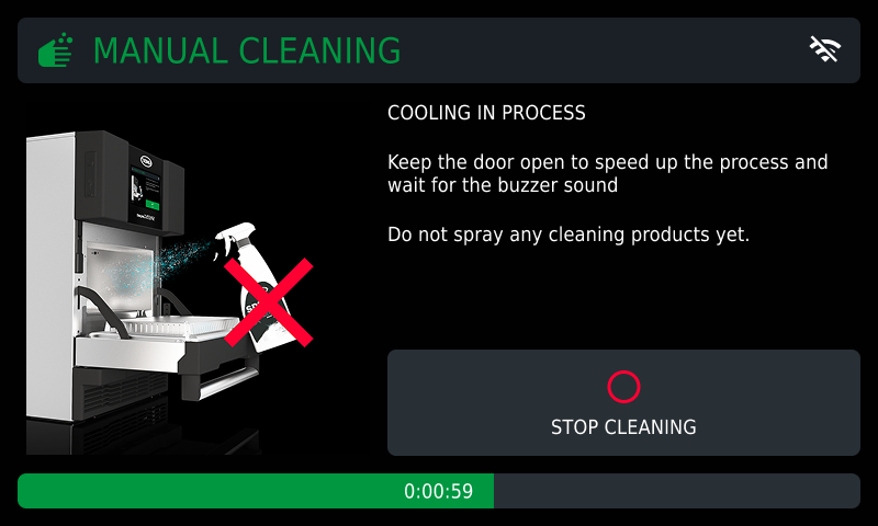 After spraying the UNOX SPRAY&Rinse detergent, LEAVE THE OVEN DOOR OPEN and wait for the cleaning process to finish (approx. 10 minutes). The time elapsed is shown on the screen.