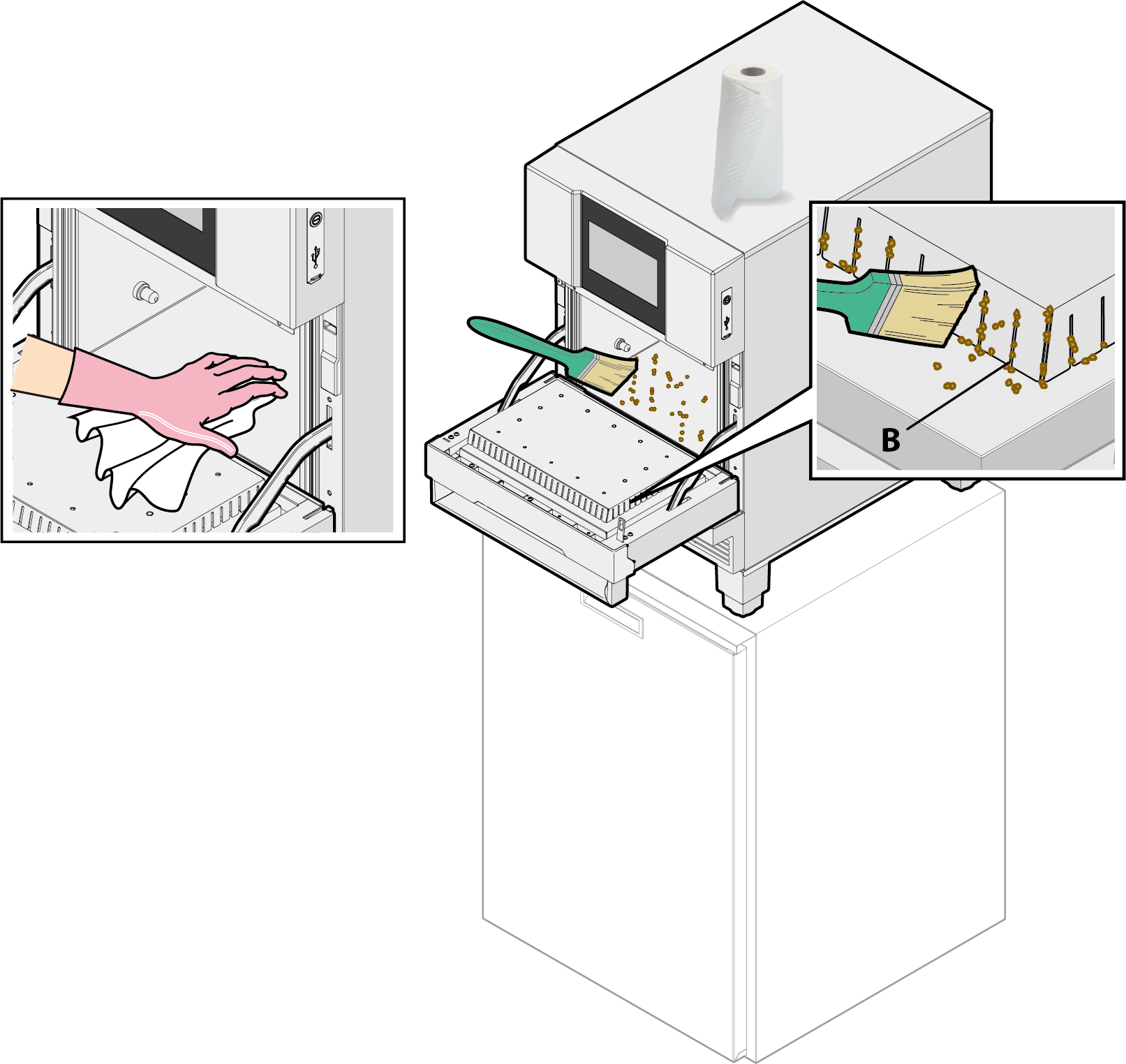 Frequently remove crumbs from inside the cavity and in particular from the slots labelled “B” in the panel behind the door.