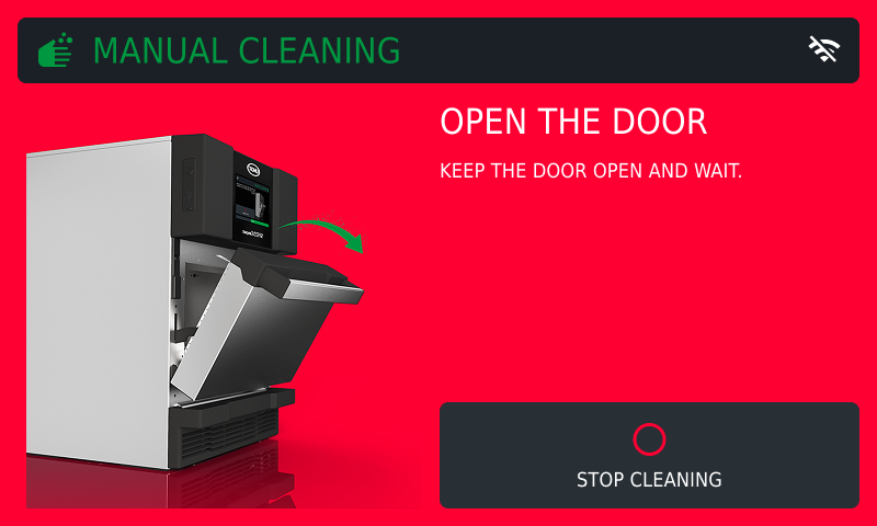 If the oven door is closed during the cleaning procedure, a red screen will show indicating that the door should be reopened, and an intermittent acoustic signal will sound.